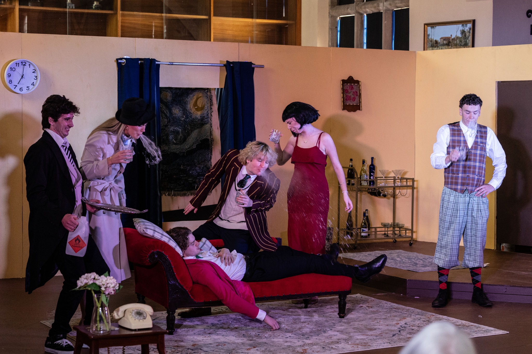 The play concludes in a farcical showdown, where Charles Haversham turns out not to be dead at all, and exposes the Inspector and Thomas for plotting to steal the Havershams’ money all along. It is here that the climax of the murderous plotline perfectly intersects with the havoc of the amateur actors, keeping the audience on their toes until the very end.